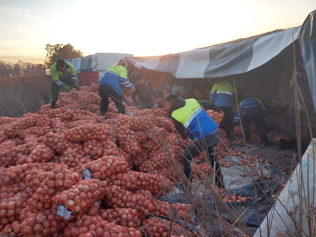 El camión viajaba cargado de bolsas de cebolla y terminó volcando su acoplado después de la rotura del neumático delantero izquierdo, lo que hizo que el chofer debiera utilizar su mayor pericia para evitar invadir el carril contrario.