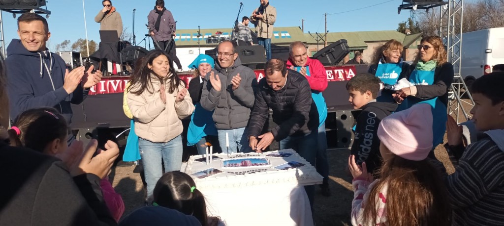 El intendente Marcos Pisano y el Senador Eduardo Bucca compartieron el festejo que había sido programado el mismo 4 de julio, cuando cumple años las localidades, para este 16 de julio, en el predio del Ferrocarril. Hubo actividades recreativas, juegos, música y torta con chocolate.-