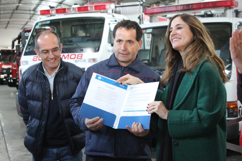 Más tarde, junto a Carlos Alfonso presidente del Consejo Nacional de Bomberos Voluntarios y la Comisión Directiva de Bomberos, encabezaron en el cuartel de Bomberos Voluntarios de Bolívar, la entrega de 141 pólizas de seguro del Banco Nación al cuerpo de bomberos y bomberas del Partido.