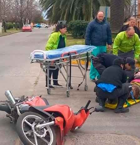 Tras el impacto, la conductora de la motocicleta fue trasladada por una ambulancia del SAME a cargo del doctor Domingo, con presumibles golpes en las rodillas y brazo.