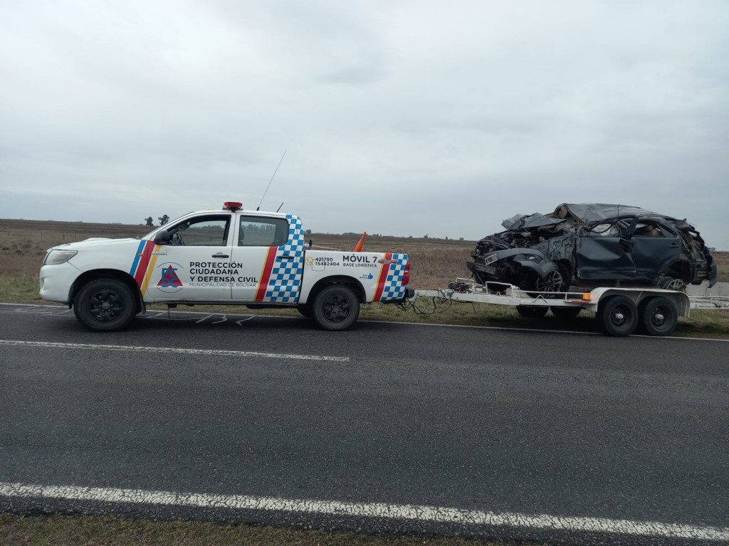 Cabe destacar que se sumó la colaboración de un transporte que hizo posible recuperar la carrocería desde el préstamo de la ruta para después transportarla hacia Bolívar.-