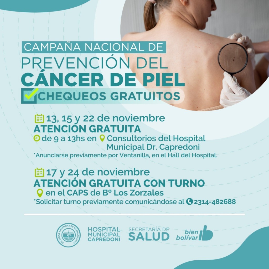 Comienza la campaña de prevención y concientización del cáncer de piel, que se llevará a cabo en el Hospital Municipal Miguel Capredoni y en el Centro de Atención Primaria de barrio Los Zorzales.-