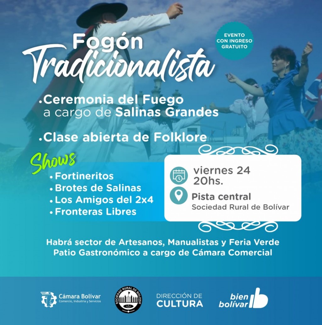 En el marco de la Expo Comercial 2023 que se desarrollará el próximo fin de semana, este viernes 24 a las 20hs tendrá lugar el Fogón Tradicionalista, en la pista central de la Sociedad Rural de Bolívar.-