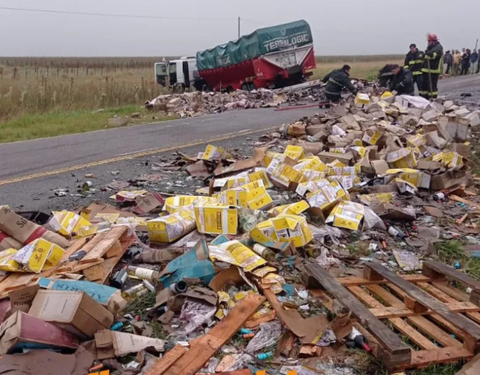 Los dos camiones tuvieron un roce y la Policía tuvo que cortar la ruta pero no pudo frenar la avalancha de gente hacia la carga que se encontraba en el camión y esparcida en la cinta asfáltica. Uno de los camiones trasladaba papa a granel, y el restante transportaba vinos, wisky, Gin y algunas otras bebidas que en el mercado diario, tiene un costo importante.-