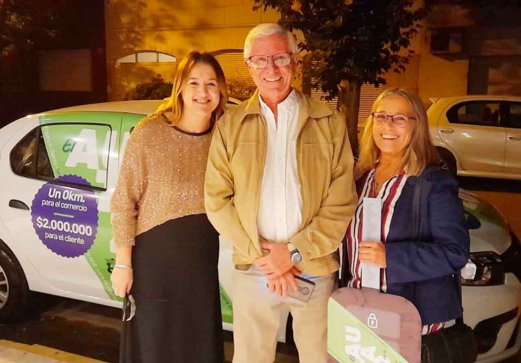 Propietario de Carnicería Bruno, donde salió el cupón que colocó Sergio Unzué como cliente, fue el beneficiado por el Renault Logan cero kilómetro. En la entrevista, Carolina Barrio-Gerente de la entidad gremial-se mostró muy conforme con lo acontecido en materia organizativa.-