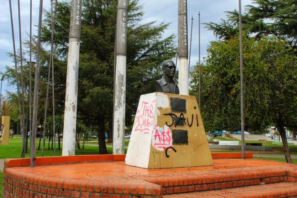 En esta ocasión, y una vez más, fue grafiteado y dañado el Monumento a Juan Domingo Perón, ubicado en Plaza Mitre.