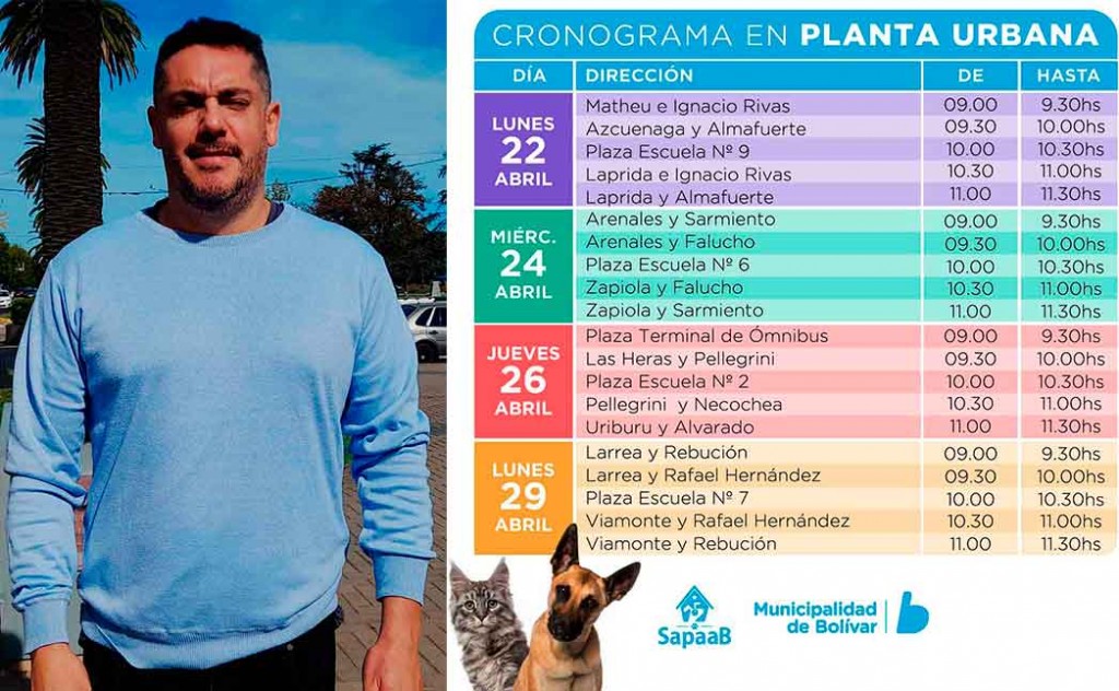 La iniciativa cuenta con un cronograma planificado con el objetivo de llegar a toda la población. Desde el lunes 22 de abril hasta el viernes 29 de abril, el cronograma estipula por la mañana el recorrido de diferentes zonas de la planta urbana. Mientras que, la semana del 3 al 17 de mayo el equipo de la Dirección de Zoonosis recorrerá los diferentes barrios de la ciudad.