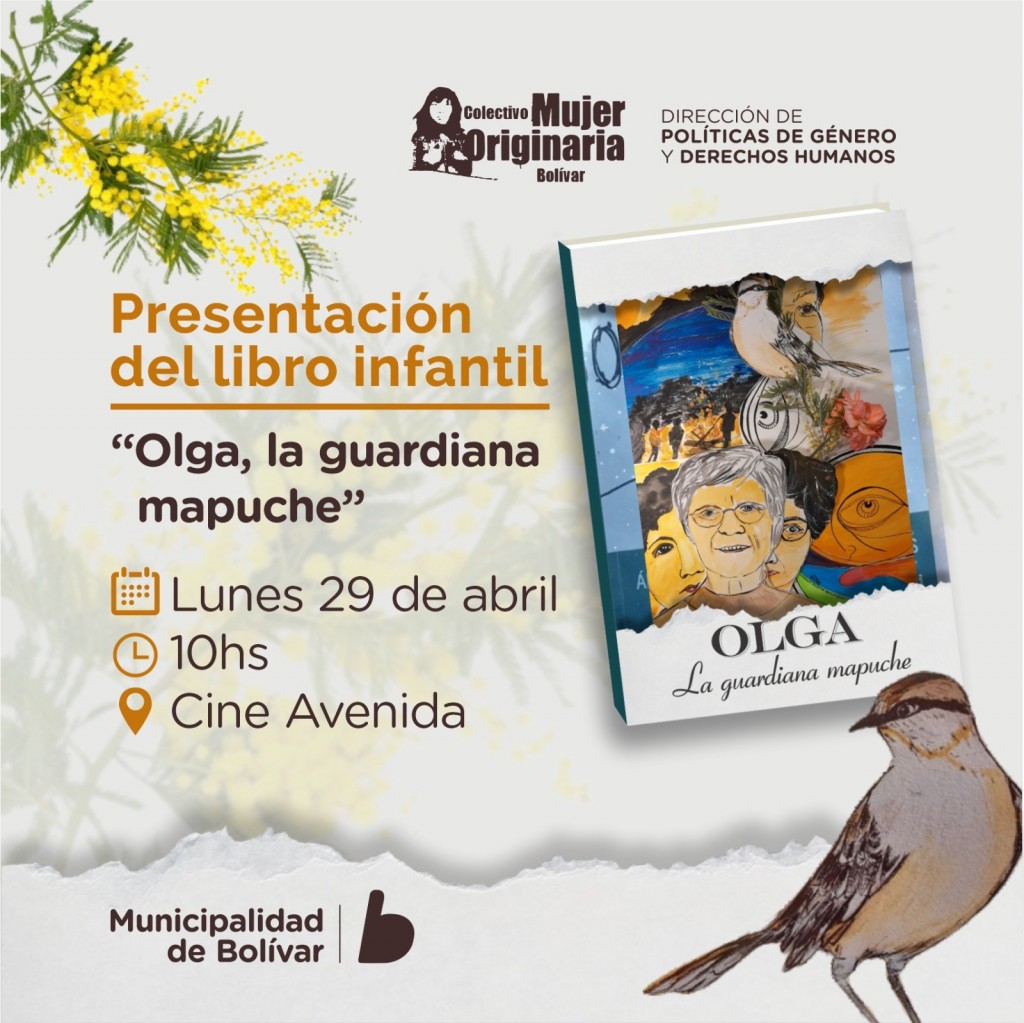 El lunes 29 de abril a las 10hs será presentado en el Cine Avenida el libro “Olga, la guardiana mapuche”, promovido por la Dirección de Políticas de Género y Derechos Humanos de la Municipalidad, escrito por el Colectivo Mujer Originaria.-