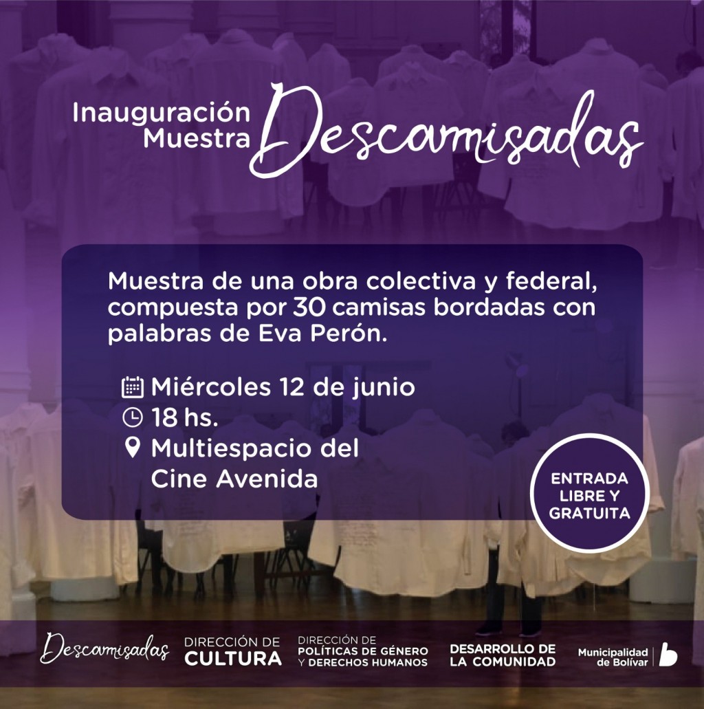 HOY MIÉRCOLES EN EL MULTIESPACIO DEL CINE AVENIDA   Se trata de una obra colectiva y federal, compuesta por 30 camisas bordadas por 24 bordadoras que eligieron algunos fragmentos de los discursos de Eva Perón y los cosieron sobre camisas blancas.     Estas mujeres trabajaron durante todo el 2023 en el bordado a mano de diferentes palabras de los discursos de Evita, y eligieron camisas blancas como lienzo para revitalizar algunas de sus frases más emblemáticas.    Al colectivo Descamisadas está conformado por Eugenia Ursi (CABA) - Graciela Vanzan (La Plata) - Soledad Echaniz (Mar del Plata) - Maite Heras (City Bell) - Inés Oviedo (CABA) - Elena Sánchez (Bolívar) - Ana María Rufinelli  (La Plata)- Lidia Subovsky (Concordia) - María Ema Papetti (Concordia)- Claudia Fernández (Ensenada)- Stella Maris Vallejos (Santa Fe)- Andrea Silvina Stochetti (La Plata)- Sidney Mann (Río Grande)- Marcela Díaz (Río Grande)- María Blanco (Rosario)- Marcela Basso (CABA)- Marcela Hernández (Rosario)- Fernanda Salinas (La Plata)- Cristina Catano (Quilmes)- Mary Leyes (Quilmes)- Edda Rúa (Mar del Plata)- Laura Stringhini (Mar del Plata)- Graciela Rojas (Rosario) y Liliana Rojas (Junín).    Con entrada libre y gratuita, la gestión municipal invita a toda la comunidad a visitar la muestra este miércoles 12 a las 18hs en el Cine Avenida.