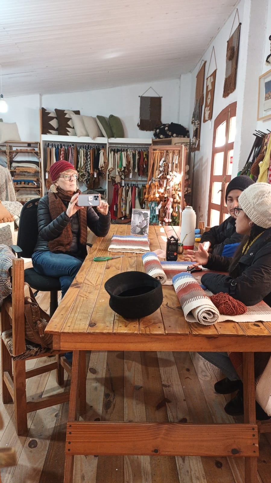 Entonces nosotros con los años fuimos consiguiendo vínculos estratégicos con clientes que están en todo el mundo, que frecuentemente nos hacen pedidos por lo menos una vez al mes cada uno, entonces además del sitio que tenemos en común para recibir a la gente que nos visita, nosotros tenemos clientes que comercializan nuestros productos y para garantizar eso durante muchos años trabajamos especializándonos en la producción de diseños, diseñamos en forma conjunta, pero somos personas que nos hemos ido capacitando en estos 20 años, algunas compañeras son licenciadas en arte, otras son arquitectas, otras son docentes de hilado y tejido en telar, nos hemos ido especializando porque el gran problema de la comercialización.