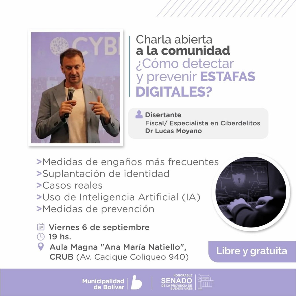 Tenemos el agrado de invitar a usted a participar de una charla abierta a la comunidad sobre "Cómo detectar y prevenir estafas digitales". Esta disertación estará a cargo del Fiscal y especialista en ciberdelitos, Dr. Lucas Moyano.