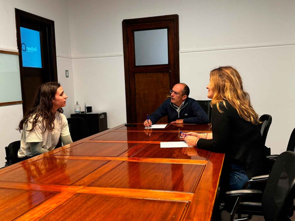 Brenda junto al intendente Marcos Pisano y la directora de Prensa, Celeste Manghi, repasaron las actividades que se planifican de manera permanente con la deportista.