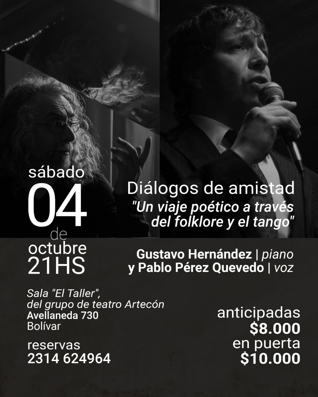 Diálogos de Amistad se presenta este sábado en Avellaneda 730, sala "El Taller" de Artecon. Gustavo Hernández estará junto a Pablo el sábado 4 de octubre a las 21 horas y las entradas se pueden sacar llamando al 2314-62-4964. Te recomendamos escuchar la entrevista completa.-
