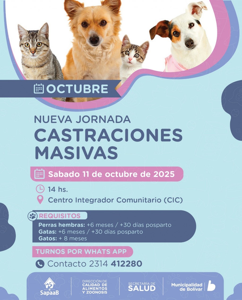 En el marco de esta tarea, el equipo municipal junto a la organización SAPAAB llevará adelante una nueva jornada de castraciones masivas el sábado 11 de octubre a las 14hs en el Centro Integrador Comunitario (CIC).