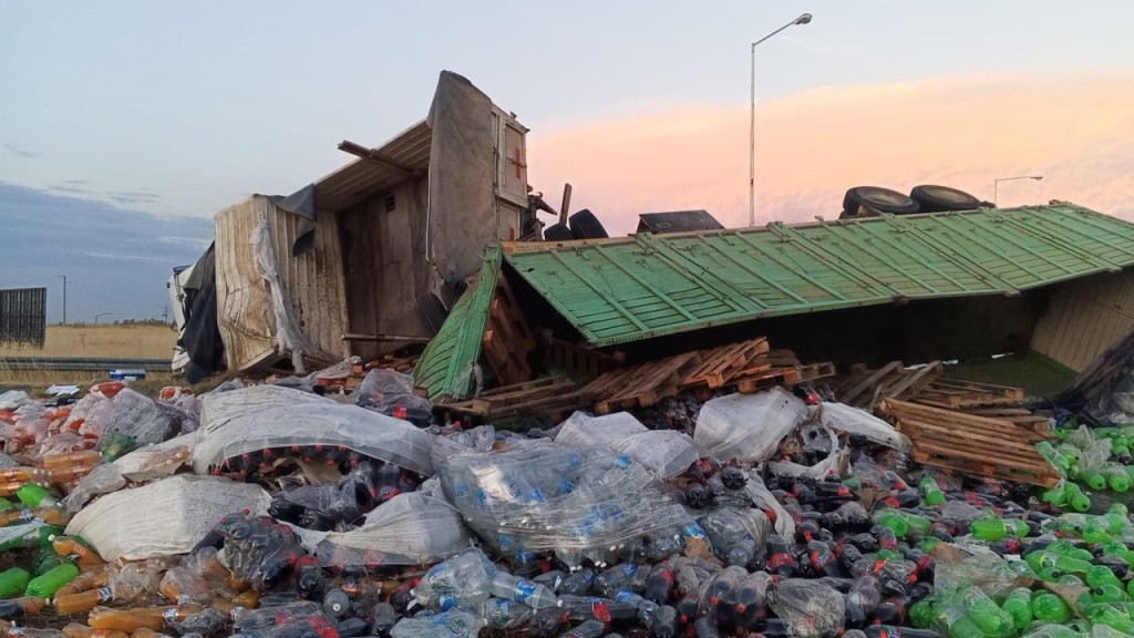 Por causas a establecer, un camión cargado de bebidas perdió el control y terminó volcando y derramando su carga en la cinta asfáltica.