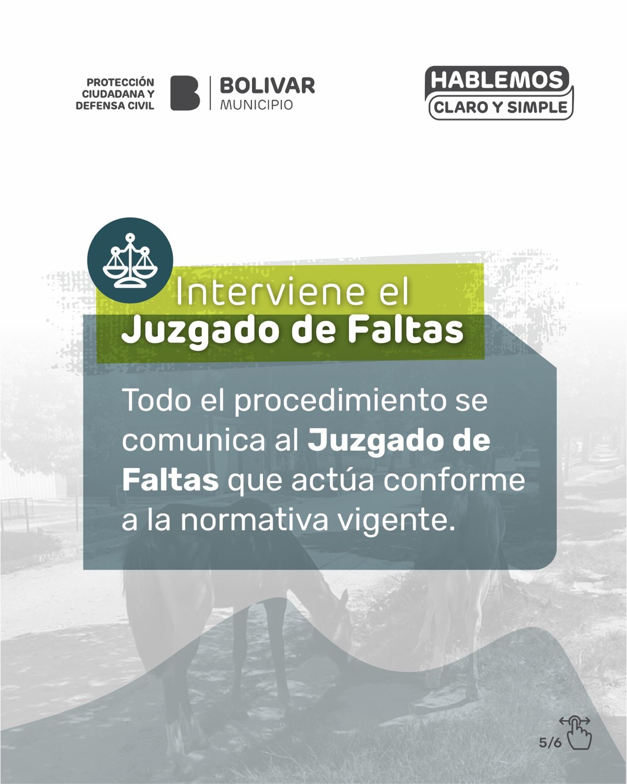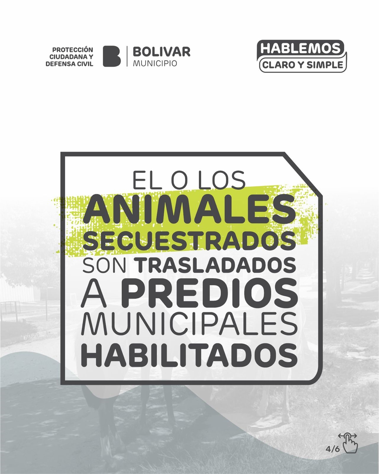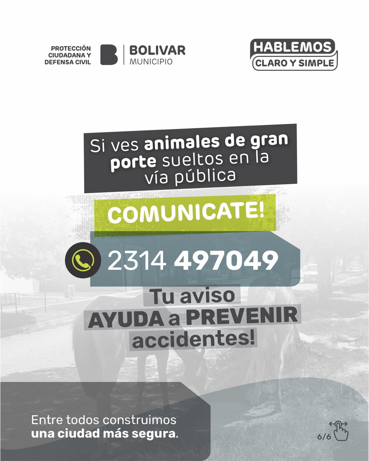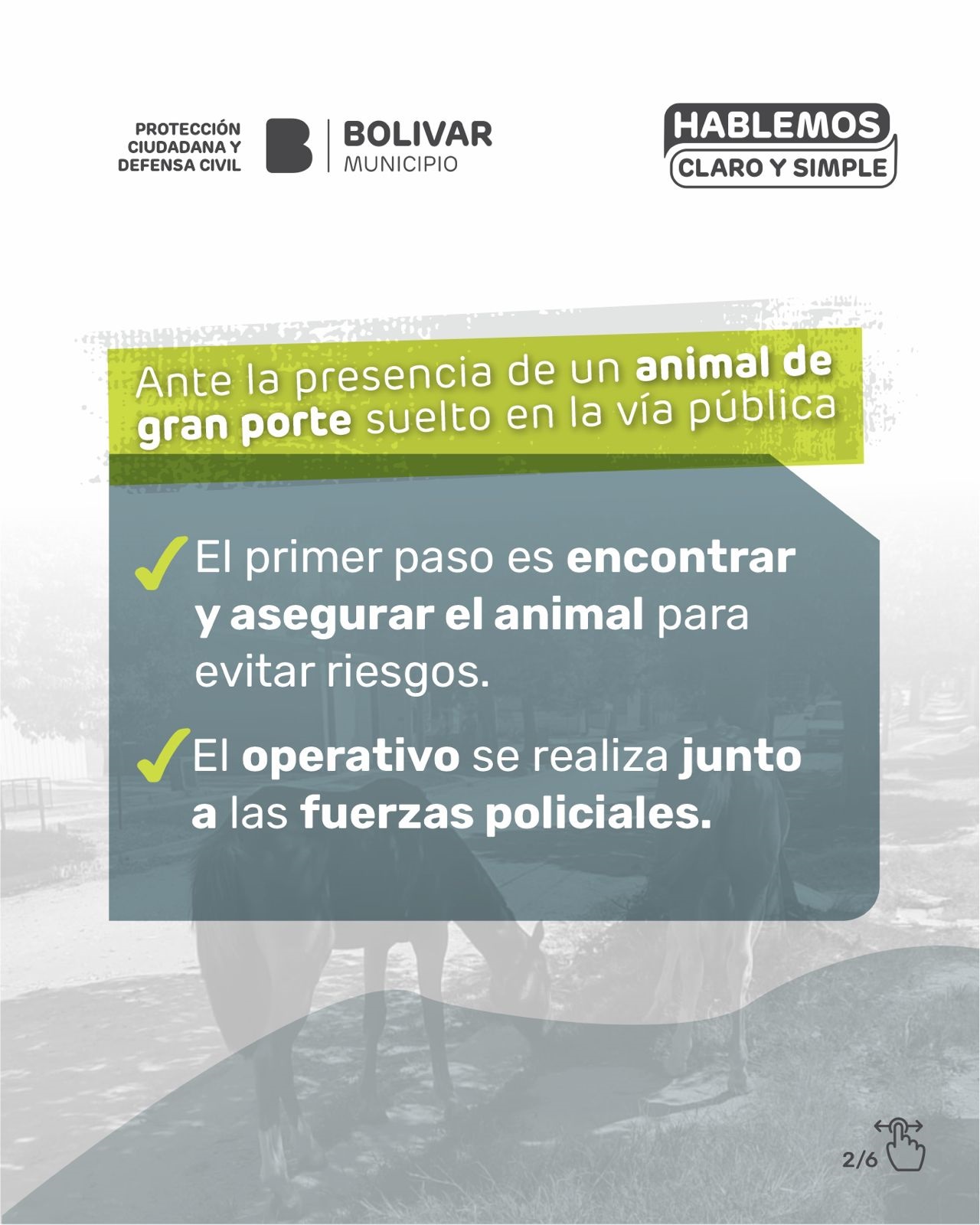 El Municipio de Bolívar, a través de la Dirección de Protección Ciudadana y Defensa Civil, informa que los animales de gran porte no pueden estar sueltos en la vía pública y que el control es permanente, en cumplimiento de la Ordenanza Municipal N° 2161/2011.-